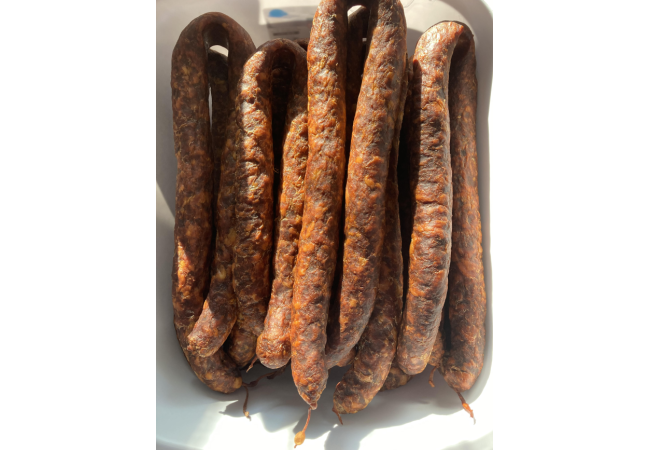 Sertéshús, zsíradék, fokhagyma, só, bors, piros paprika, örölt kömény, csípős paprika. ( A kolbász súlya nem pontosan 1 lb, fizetéskor a tényleges súly szerint számolunk.)